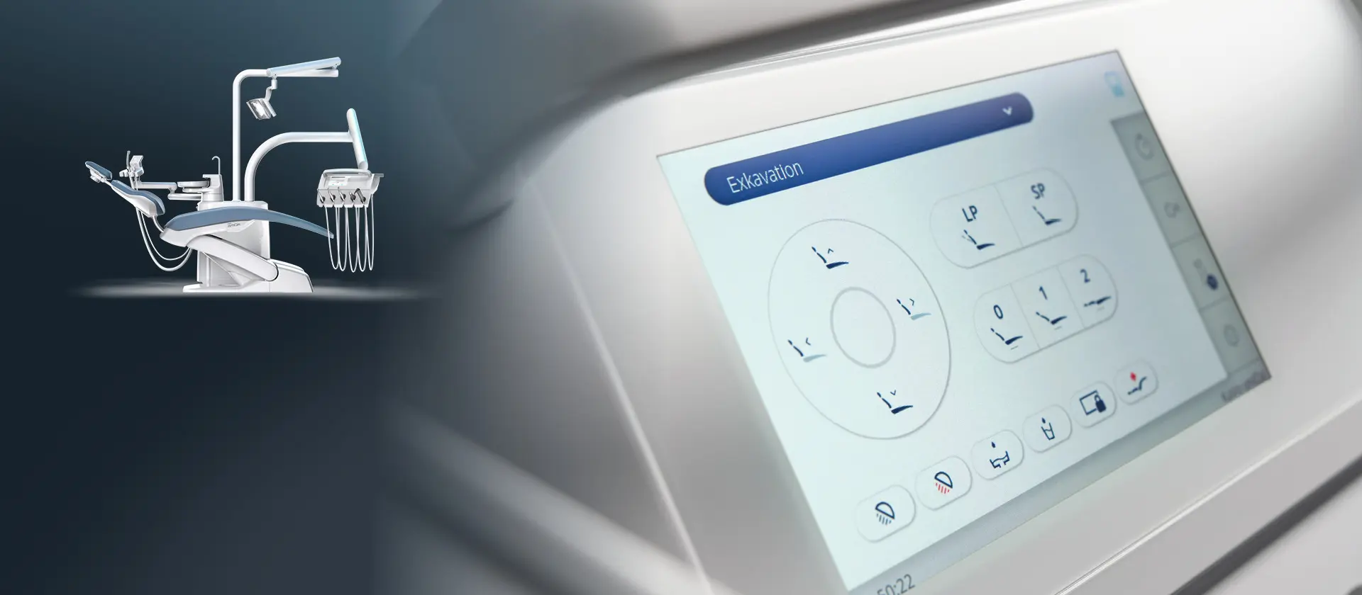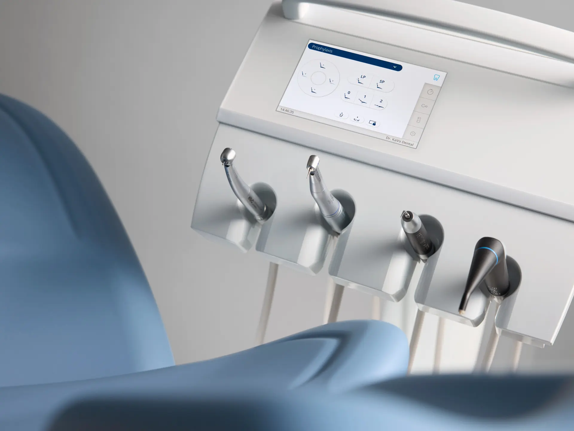 Stylowy wygląd z wyraźnie sportową linią Intuicyjny 7‑calowy wyświetlacz dotykowy o wysokiej rozdzielczości Intuicyjna instrukcja higieny i kompaktowa stacja dezynfekcji rękawów Kompaktowy stolik asysty z trzema uchwytami na instrumenty Komfort podczas zabiegów i doskonała widoczność dzięki lampie zabiegowej KaVo Lumina Najwyższa pozycja: 830 mm; najniższa pozycja: 350 mm; maksymalna masa pacjenta: 185 kg Intuicyjny interfejs i kompaktowe centrum higieny do skutecznego płukania i dezynfekcji rękawów instrumentów